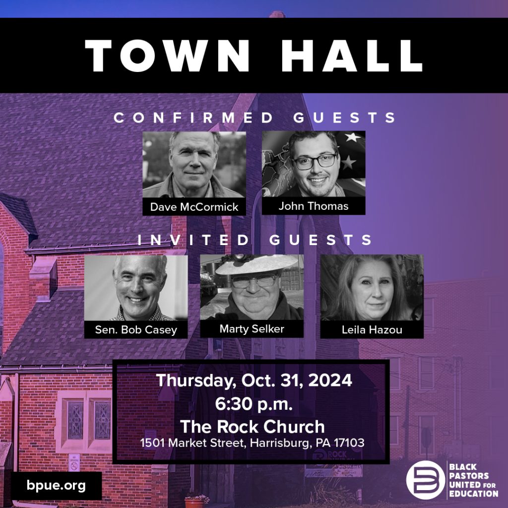 Tonight, Thursday, October 31, 2024, at 6:30 p.m., Black Pastors United for Education will host a town hall with Pennsylvania candidates for U.S. Senate. The town hall meeting with members of local congregations will address questions and concerns about the state of education in America.
